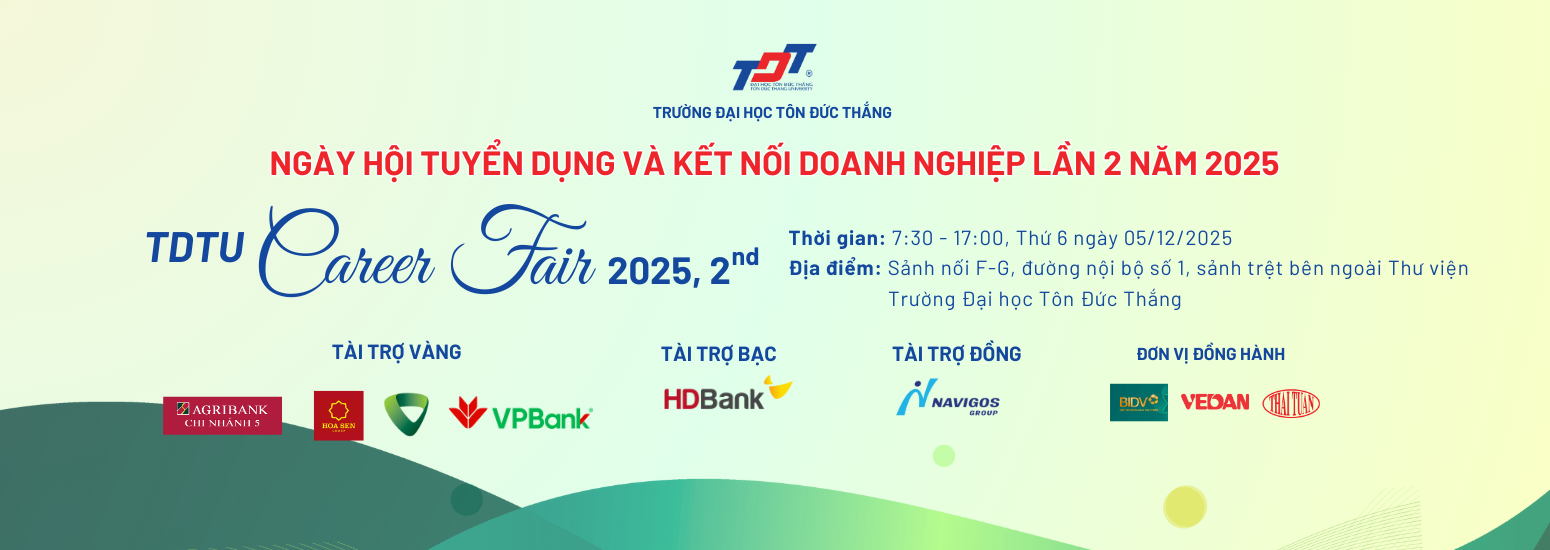 Trang chủ Tin tức - sự kiện Chương trình HDBank Future Banker 2025 Tin tức - Sự kiện , 13 Th11 25 Chuyên đề “Tối ưu hiệu suất gara với hệ sinh thái Milwaukee” – Nâng cao kỹ năng thực hành và mở rộng kết nối doanh nghiệp Tin tức - Sự kiện , 22 Th10 25 Xem thêm >> Việc làm và kết nối cựu sinh viên Đăng ký tham gia Sự kiện T12 05 Ngày hội tuyển dụng và kết nối doanh nghiệp Trường Đại học Tôn Đức Thắng lần 2 năm 2025 T11 17 Cuộc thi "Tìm kiếm ý tưởng khởi nghiệp sinh viên TDTU năm học 2025-2026" T10 21 Chuyên đề "Tối ưu hiệu suất gara với hệ sinh thái Milwaukee" Việc làm - Thực tập Công ty TNHH Tư vấn Phạm Consult tuyển dụng Thực tập sinh kế toán và Thực tập sinh kiểm toán Ngân hàng TMCP Việt Nam Thịnh Vượng (VPBank) tuyển dụng Nhân viên/Chuyên viên Bán hàng trực tiếp Công ty TNHH Công nghệ Năng lượng INS tuyển dụng Thực tập sinh phòng dự án Tập đoàn Hoa Sen – Hoa Sen Home tuyển dụng Quản trị viên dự nguồn Công ty TNHH Kumkang Kind Việt Nam tuyển dụng Nhân viên Thiết kế Cốp Pha Nhôm Tổ chức Tư vấn Giáo dục Quốc tế IECS tuyển dụng Nhân viên tư vấn tuyển sinh và Nhân viên Kế toán Công ty TNHH Melody Decor tuyển dụng Thực tập sinh Ele Academy tuyển dụng Nhân viên Tư vấn tuyển sinh Ele Academy tuyển dụng Thực tập sinh Giáo viên tiếng Anh và tiếng Trung Xem thêm >> Cựu sinh viên tiêu biểu Cựu sinh viên Tổng kết hoạt động kết nối cựu sinh viên chào mừng 28 năm Ngày thành lập Trường Đại học Tôn Đức Thắng Cựu sinh viên Trường Đại học Tôn Đức Thắng tổ chức Ngày hội kết nối cựu sinh viên năm 2025 Cựu sinh viên “TDTU: 27 năm – Ngày hội Cựu sinh viên” – Hướng tới kỷ niệm Ngày thành lập Trường năm 2024 Cựu sinh viên “TDTU: 27 năm –Ngày hội cựu sinh viên” Kết nối cộng đồng cựu sinh viên năm 2024 Cựu sinh viên Ngày hội doanh nghiệp Cựu sinh viên năm 2024 Cựu sinh viên Ngày hội doanh nghiệp cựu sinh viên Trường Đại học Tôn Đức Thắng năm 2024 Cựu sinh viên Trung tâm Hợp tác doanh nghiệp và cựu sinh viên tổ chức giải bóng đá giao hữu nhân dịp kỷ niệm 41 năm Ngày Nhà giáo Việt Nam 20/11/2023 Cựu sinh viên Trung tâm hợp tác doanh nghiệp và cựu sinh viên Trường Đại học Tôn Đức Thắng tổ chức buổi chia sẻ chủ đề “Chinh phục nhà tuyển dụng” Hoạt động kết nối doanh nghiệp TDTU ký kết hợp tác với Công ty Cổ phần Y tế Phúc Thịnh Trường Đại học Tôn Đức Thắng ký kết hợp tác với Báo Tuổi Trẻ Trường Đại học Tôn Đức Thắng ký kết hợp tác với Tập đoàn TTC Lễ ký kết thoả thuận hợp tác giữa Trường Đại học Tôn Đức Thắng (TDTU) với Hiệp hội tái chế chất thải Việt Nam Trường Đại học Tôn Đức Thắng ký kết hợp tác với Ngân hàng TMCP Đại chúng Việt Nam (PVcomBank) Ký kết thỏa thuận hợp tác với BIDV chi nhánh Kỳ Hòa LỄ KÍ KẾT THỎA THUẬN HỢP TÁC VÀ BIÊN BẢN XÁC NHẬN TÀI TRỢ CHO GIÁO DỤC GIỮA KHOA MỸ THUẬT CÔNG NGHIỆP VÀ CÔNG TY MEMETOON ENTERTAINMENT (HÀN QUỐC) Trường Đại học Tôn Đức Thắng ký kết mở rộng hợp tác song phương với Trường Đại học Quốc gia Chungbuk, Hàn Quốc Trường Đại học Tôn Đức Thắng tiếp và làm việc với Đoàn Trường Đại học Quốc gia Thanh Hoa, Đài Loan Trường Đại học Tôn Đức Thắng ký kết thỏa thuận hợp tác với Công ty TNHH CRIF D&B Việt Nam