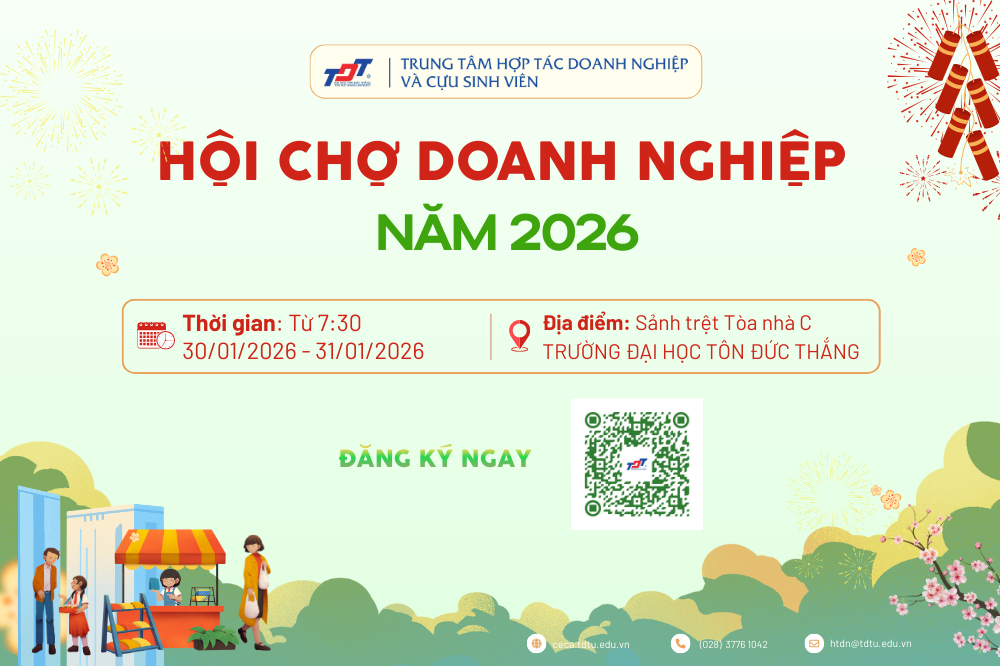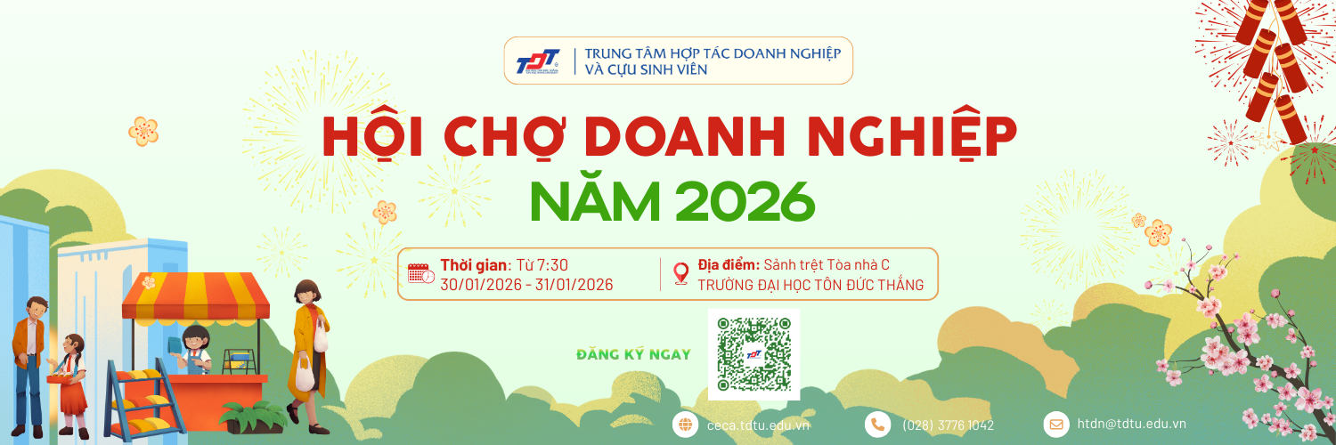 Trang chủ Tin tức - sự kiện Buổi Tập huấn “Kỹ năng giao tiếp & hùng biện thuyết phục” trong khuôn khổ Cuộc thi “Tìm kiếm ý tưởng khởi nghiệp sinh viên TDTU năm học 2025–2026” Tin tức - Sự kiện , 10 Th12 25 Trường Đại học Tôn Đức Thắng tổ chức Ngày hội tuyển dụng và kết nối doanh nghiệp lần 2 năm 2025 Tin tức - Sự kiện , 09 Th12 25 Xem thêm >> Việc làm và kết nối cựu sinh viên Đăng ký tham gia Sự kiện T01 30 HỘI CHỢ DOANH NGHIỆP NĂM 2026 T12 05 Ngày hội tuyển dụng và kết nối doanh nghiệp Trường Đại học Tôn Đức Thắng lần 2 năm 2025 T11 17 Cuộc thi "Tìm kiếm ý tưởng khởi nghiệp sinh viên TDTU năm học 2025-2026" Việc làm - Thực tập Trường Đại học Tôn Đức Thắng thông báo tuyển dụng viên chức đợt 1 năm 2026 Vietnamese Language Garden (VLG) tuyển dụng Giáo viên dạy tiếng Việt cho Người nước ngoài Công ty Cổ phần Tập đoàn Maxan Agri tuyển dụng nhiều vị trí Công ty Cổ phần Tập đoàn Maxan Agri tuyển dụng nhiều vị trí Tổ chức Tư vấn Giáo dục Quốc tế IECS tuyển dụng Thực tập sinh Tổ chức Tư vấn Giáo dục Quốc tế IECS tuyển dụng Thực tập sinh Công ty Cổ phần Chứng khoán Agribank tuyển dụng nhiều vị trí Bộ Khoa học và Công nghệ tuyển dụng Công chức năm 2025 Công ty Invisible Technologies tuyển dụng Chuyên gia tiếng Việt mảng STEM và Ngôn ngữ (Làm việc từ xa) Xem thêm >> Cựu sinh viên tiêu biểu Cựu sinh viên Tổng kết hoạt động kết nối cựu sinh viên chào mừng 28 năm Ngày thành lập Trường Đại học Tôn Đức Thắng Cựu sinh viên Trường Đại học Tôn Đức Thắng tổ chức Ngày hội kết nối cựu sinh viên năm 2025 Cựu sinh viên “TDTU: 27 năm – Ngày hội Cựu sinh viên” – Hướng tới kỷ niệm Ngày thành lập Trường năm 2024 Cựu sinh viên “TDTU: 27 năm –Ngày hội cựu sinh viên” Kết nối cộng đồng cựu sinh viên năm 2024 Cựu sinh viên Ngày hội doanh nghiệp Cựu sinh viên năm 2024 Cựu sinh viên Ngày hội doanh nghiệp cựu sinh viên Trường Đại học Tôn Đức Thắng năm 2024 Cựu sinh viên Trung tâm Hợp tác doanh nghiệp và cựu sinh viên tổ chức giải bóng đá giao hữu nhân dịp kỷ niệm 41 năm Ngày Nhà giáo Việt Nam 20/11/2023 Cựu sinh viên Trung tâm hợp tác doanh nghiệp và cựu sinh viên Trường Đại học Tôn Đức Thắng tổ chức buổi chia sẻ chủ đề “Chinh phục nhà tuyển dụng” Hoạt động kết nối doanh nghiệp Trường Đại học Tôn Đức Thắng Ký Kết Hợp Tác Với Tập Đoàn CT Group TDTU ký kết hợp tác với Công ty Cổ phần Y tế Phúc Thịnh Trường Đại học Tôn Đức Thắng ký kết hợp tác với Báo Tuổi Trẻ Trường Đại học Tôn Đức Thắng ký kết hợp tác với Tập đoàn TTC Lễ ký kết thoả thuận hợp tác giữa Trường Đại học Tôn Đức Thắng (TDTU) với Hiệp hội tái chế chất thải Việt Nam Trường Đại học Tôn Đức Thắng ký kết hợp tác với Ngân hàng TMCP Đại chúng Việt Nam (PVcomBank) Ký kết thỏa thuận hợp tác với BIDV chi nhánh Kỳ Hòa LỄ KÍ KẾT THỎA THUẬN HỢP TÁC VÀ BIÊN BẢN XÁC NHẬN TÀI TRỢ CHO GIÁO DỤC GIỮA KHOA MỸ THUẬT CÔNG NGHIỆP VÀ CÔNG TY MEMETOON ENTERTAINMENT (HÀN QUỐC) Trường Đại học Tôn Đức Thắng ký kết mở rộng hợp tác song phương với Trường Đại học Quốc gia Chungbuk, Hàn Quốc Trường Đại học Tôn Đức Thắng tiếp và làm việc với Đoàn Trường Đại học Quốc gia Thanh Hoa, Đài Loan